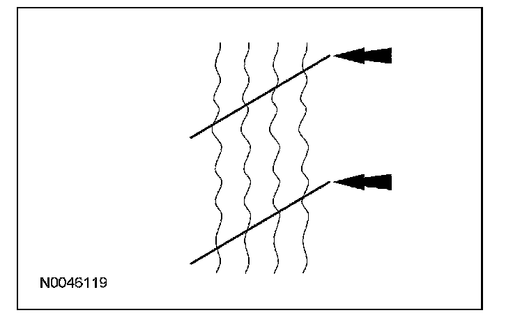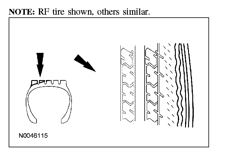 1. Inspect the tires for signs of uneven wear. Refer to the following descriptions to identify the type of wear and GO to Symptom Chart - Tire Wear for the appropriate repair action to be carried out. Symptom Chart - Tire Wear