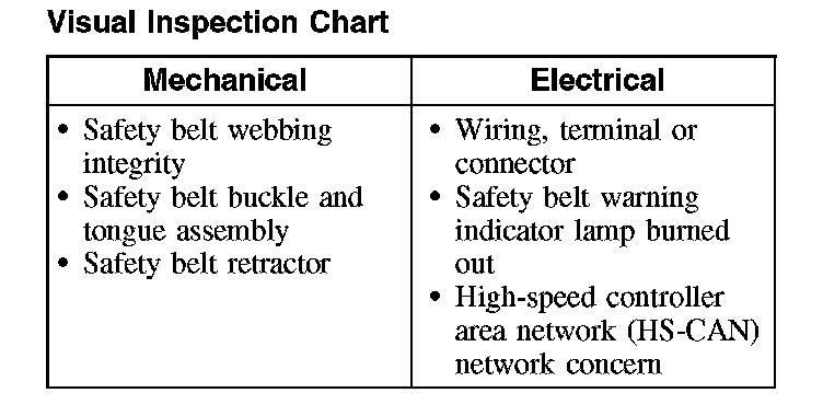 3. If the inspection reveals an obvious concern(s) that can be readily identified, service as required. With the exception of removing a twist from the safety belt webbing, do not attempt to repair a component of the safety belt system; new components must be installed.