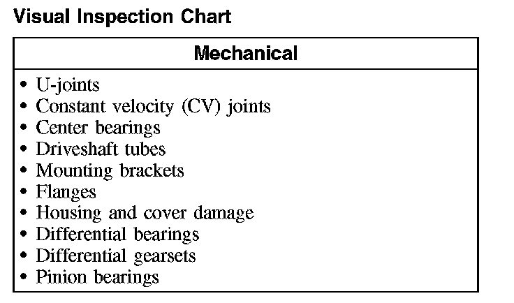 With the vehicle in NEUTRAL, position it on a hoist. Refer to Maintenance/Service and Repair. Rotate the driveshaft by hand. Check for rough operation or seizure of the U-joints or CV joints. Install a new driveshaft if it shows signs of seizure, excessive wear or incorrect seating.