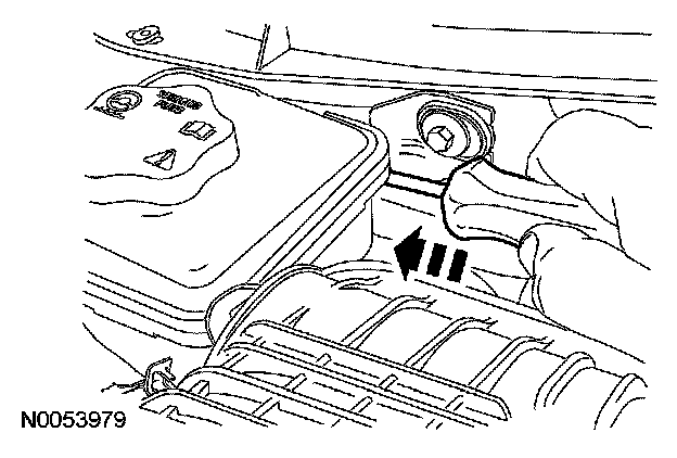 7. Push the retainer rearward to remove the power steering reservoir. Position the reservoir aside.