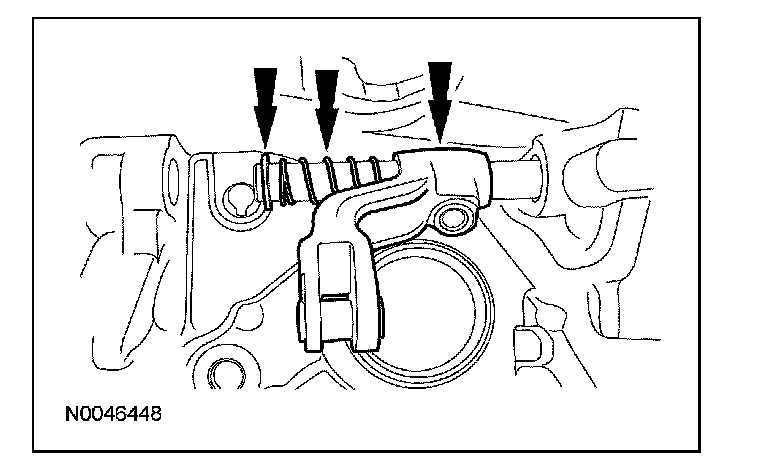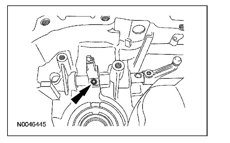 13. Install the shift lever into the case. Install the control arm and key, the spring and the washer. Push the assembly inward. Align the control arm bolt with the notch on the shift lever rod. Install the bolt.