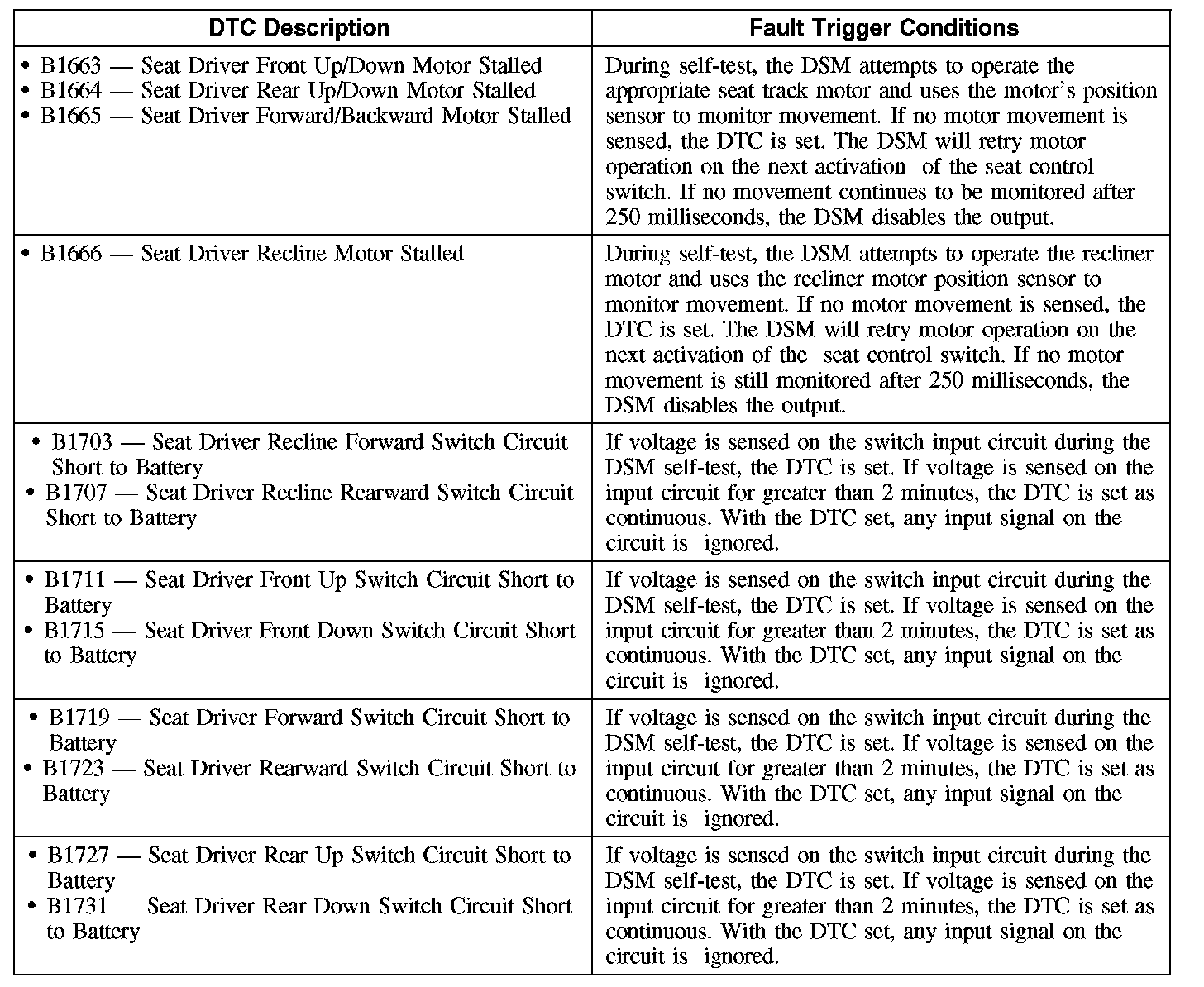 Each motor, in the memory power seat track and power recliner mechanism contains a Hall-effect position sensor. The DSM supplies a shared signal feed circuit to each position sensor. Each position sensor sends a signal pulse back to the DSM used to monitor the position of the power seat and seat backrest. The DSM uses this information to return the seat to a stored pre-programmed position when pressing the memory SET switch or a remote entry transmitter. For information on programming memory positions or recalling a stored memory position, refer to Memory Position Programming. Programming and Relearning