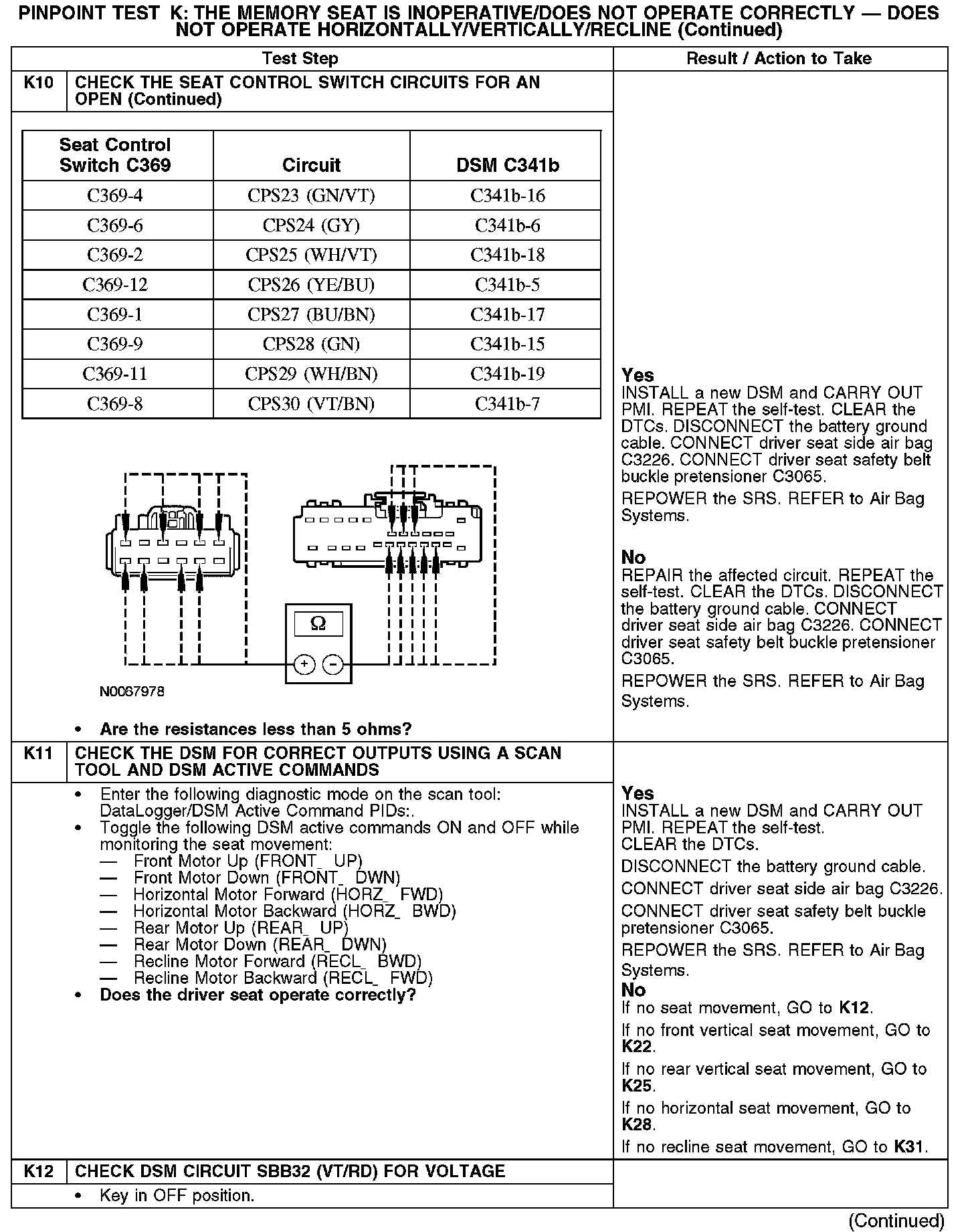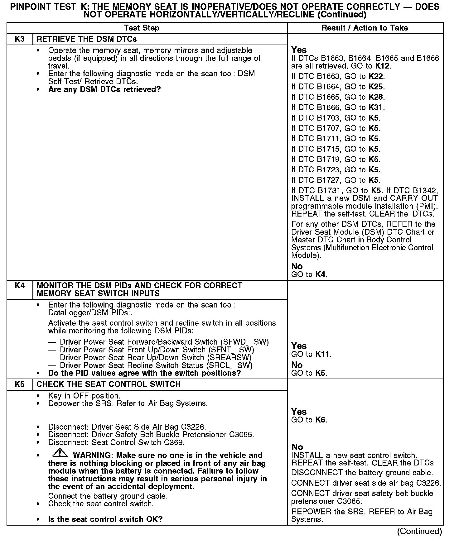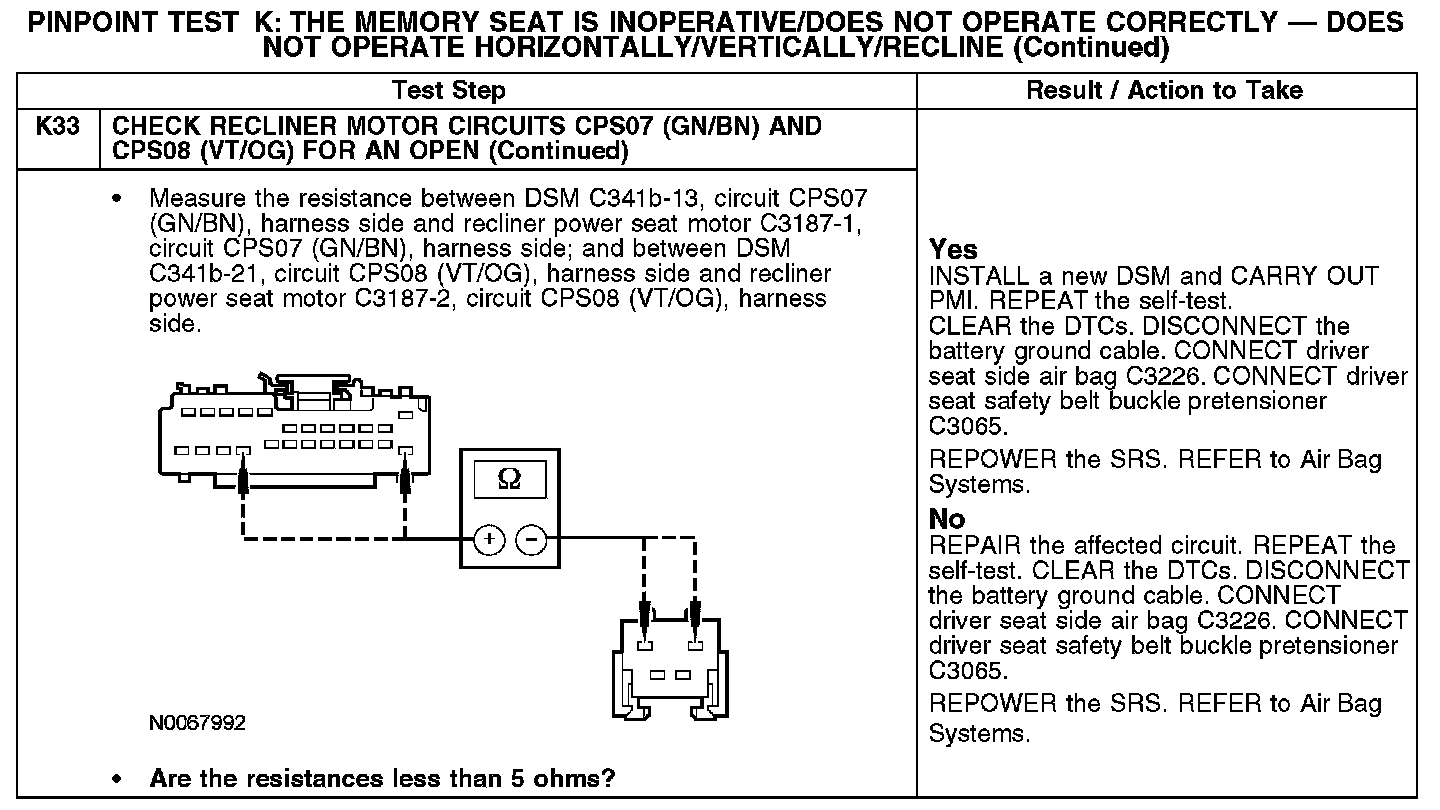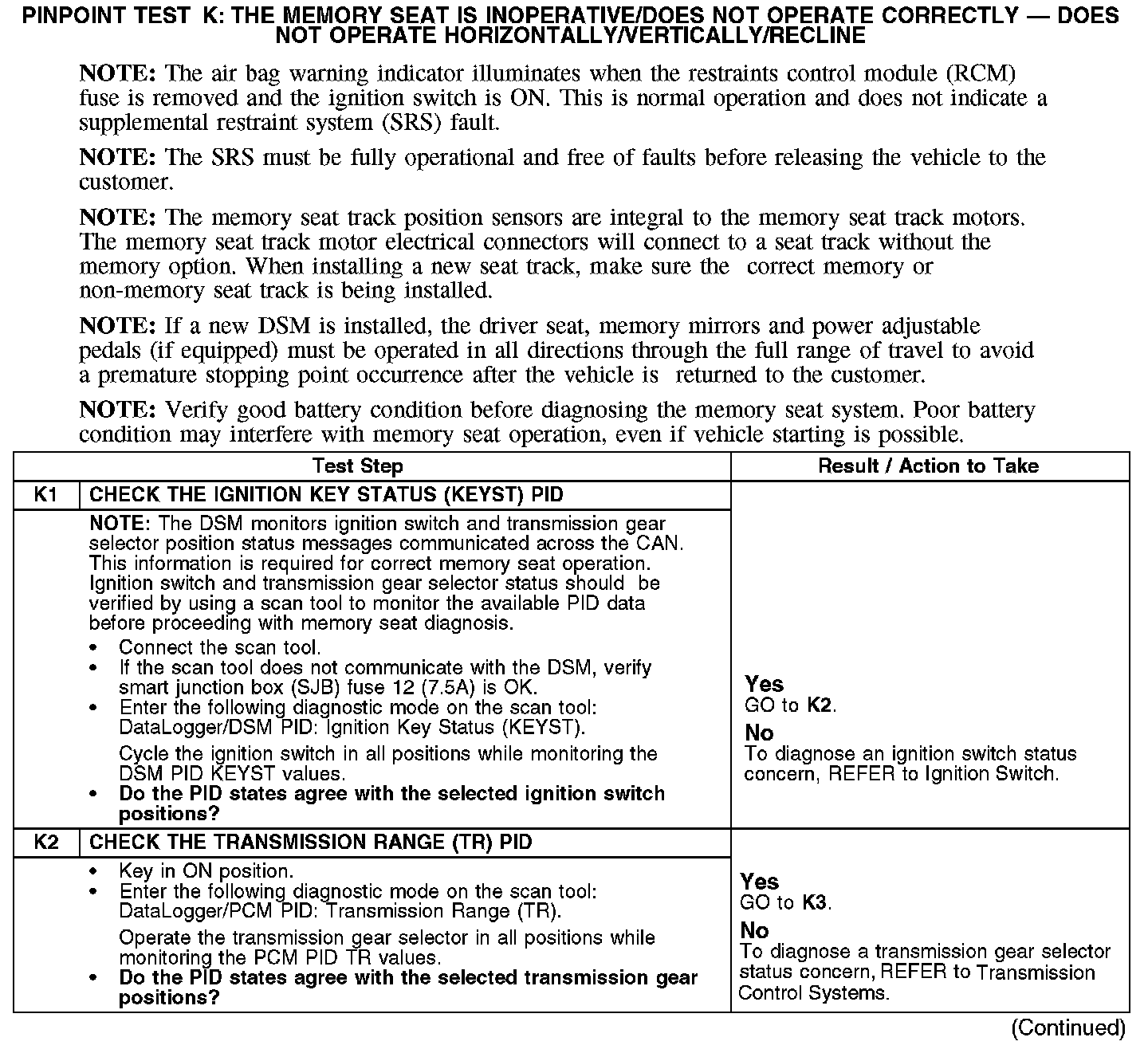 PINPOINT TEST K: THE MEMORY SEAT IS INOPERATIVE/DOES NOT OPERATE CORRECTLY - DOES NOT OPERATE HORIZONTALLY/VERTICALLY/RECLINENormal Operation