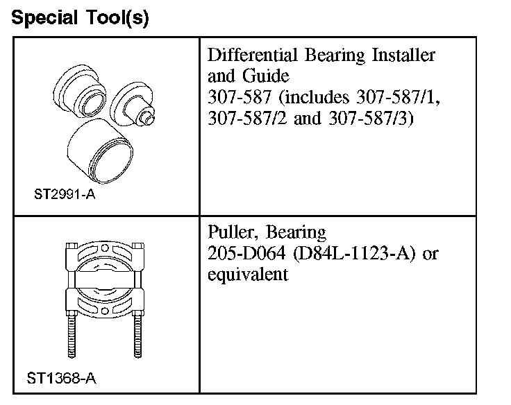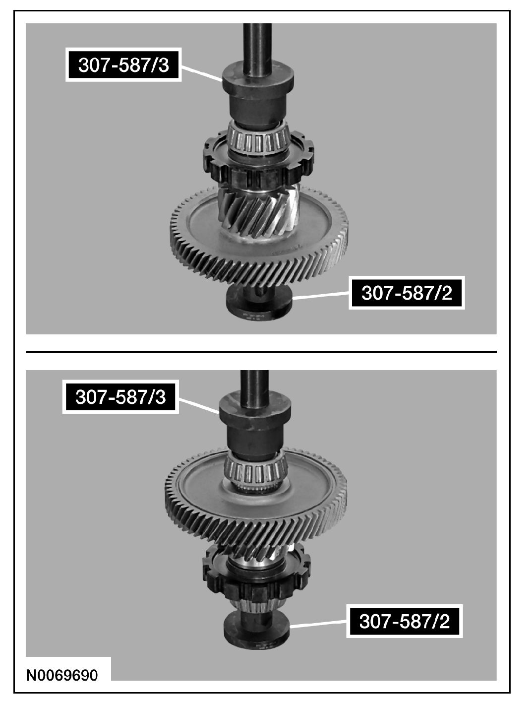 2. Using the Differential Bearing Installer and Guide 307-587 (307-587/2 and 307-587/3) and a press, install new transfer shaft bearings on the transfer shaft assembly.