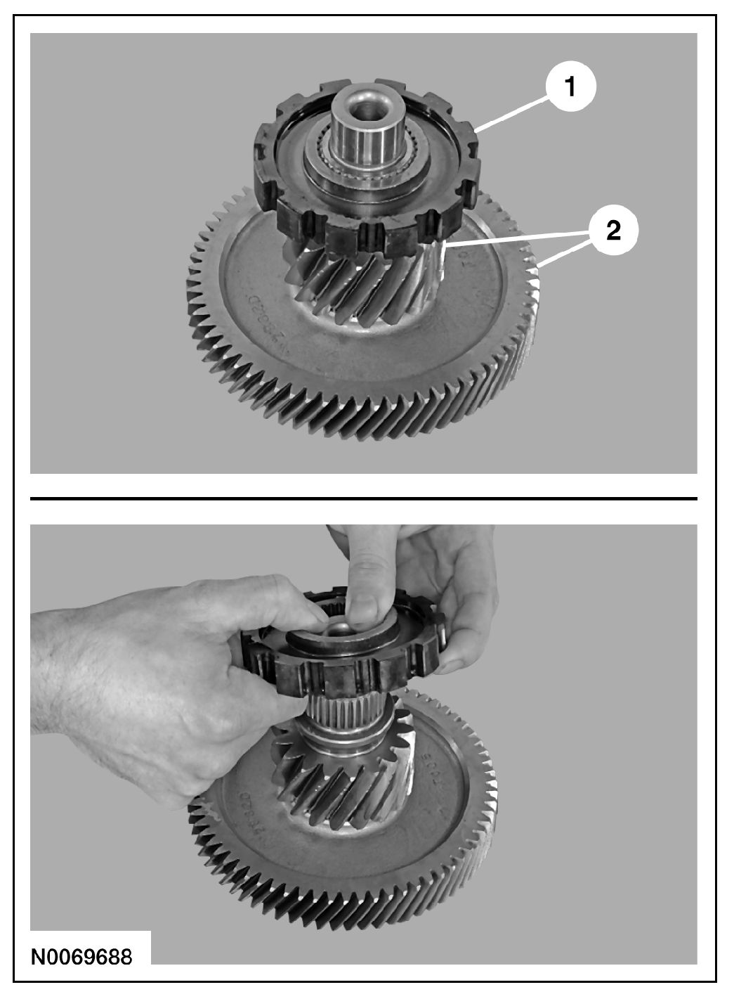 1. Install the park pawl wheel on the transfer shaft.