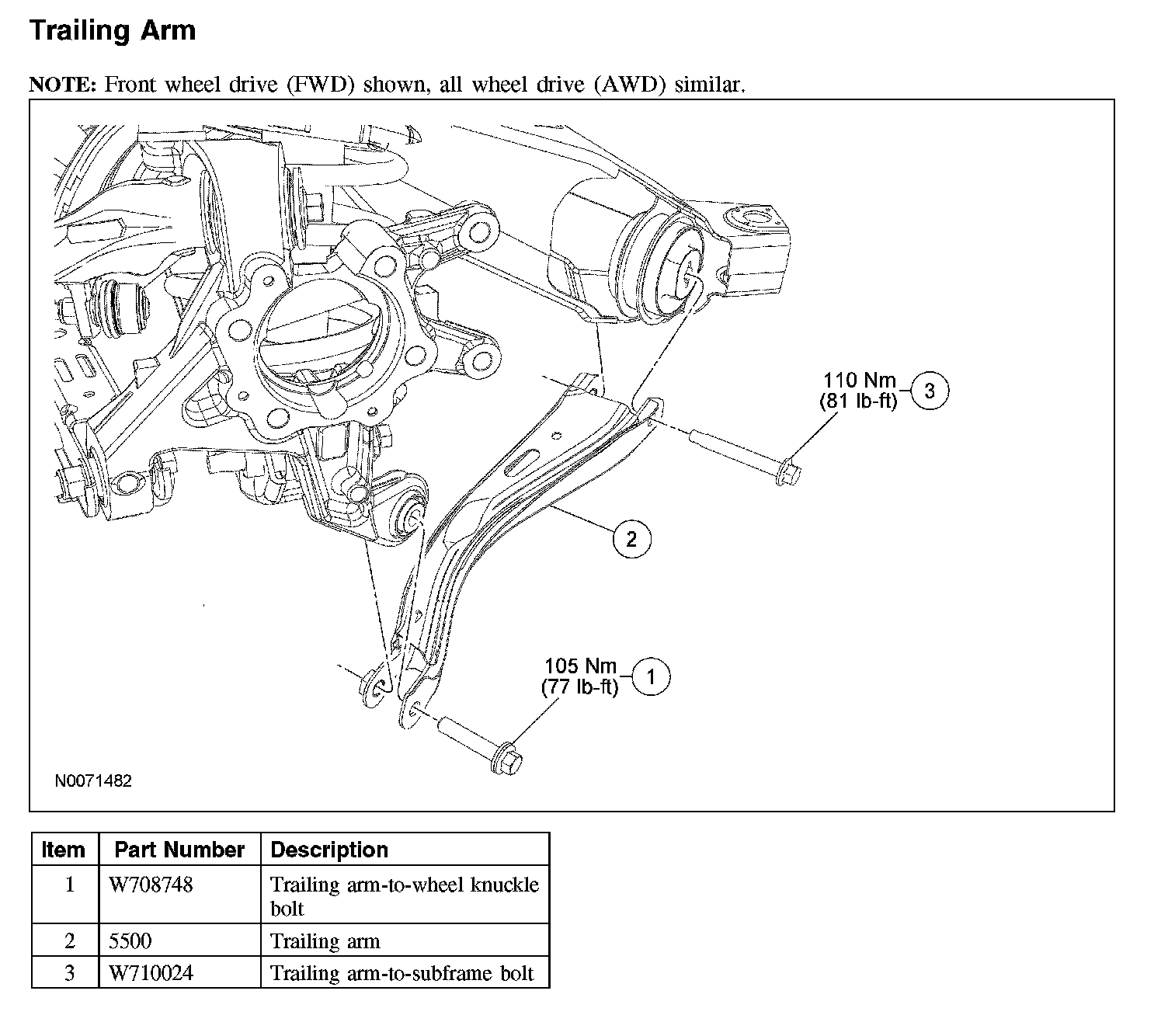 Trailing ArmNOTE: Front wheel drive (FWD) shown, all wheel drive (AWD) similar.