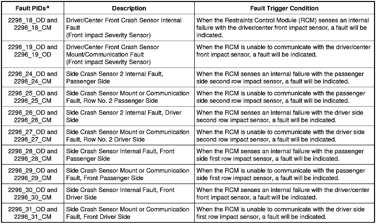 a Fault PIDs that end in OD indicate an on-demand status and are associated with on-demand DTC B2296. Fault PIDs that end in CM indicate continuous memory status and are associated with continuous DTC B2296.