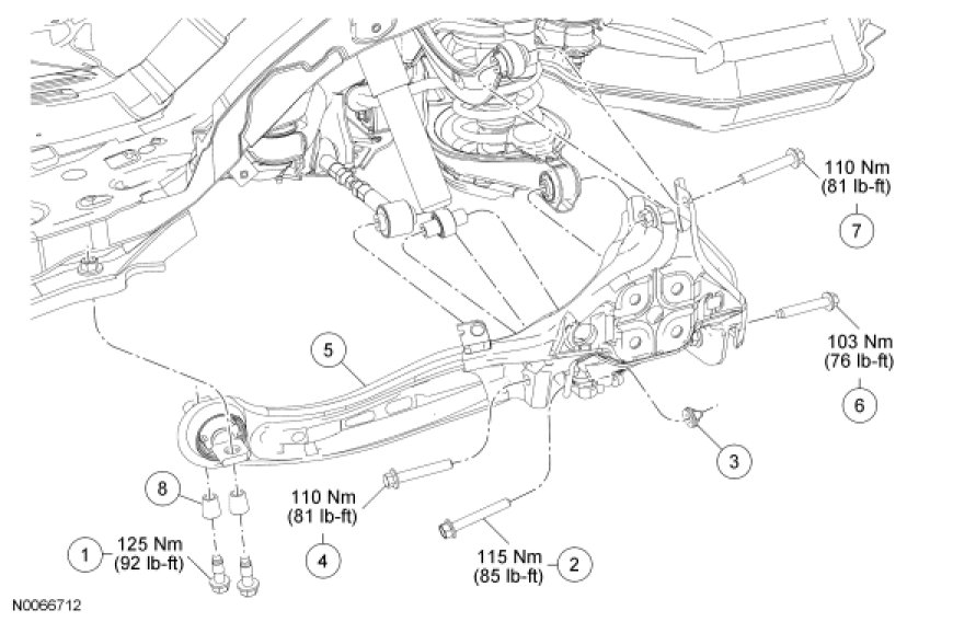 - To install, tighten the new bolt to 110 Nm (81 lb-ft) with the suspension at the bushing fastener tightening position.