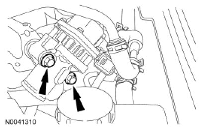 14. Remove the 2 bolts and the EGR valve. Discard the gasket.
