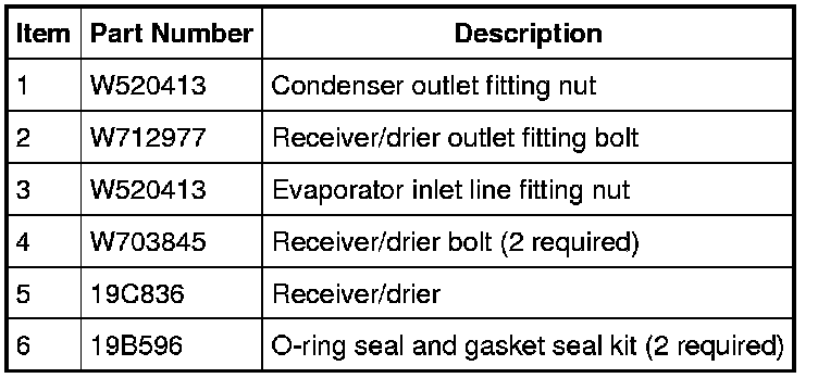 NOTE: Installation of a new receiver/drier is not required when repairing the A/C system, except when there is physical evidence of contamination from a failed A/C compressor or damage to the receiver/drier. Damage to the receiver/drier includes leaks in the receiver/drier, physical damage to the receiver/drier shell or desiccant, or moisture contamination. Moisture contamination results only from a complete loss of refrigerant and equalization of the refrigerant system pressure with atmospheric pressure for a period longer than one hour. If even a slight amount of positive refrigerant pressure is present in the system before repairs are carried out, the receiver/drier should not be replaced.