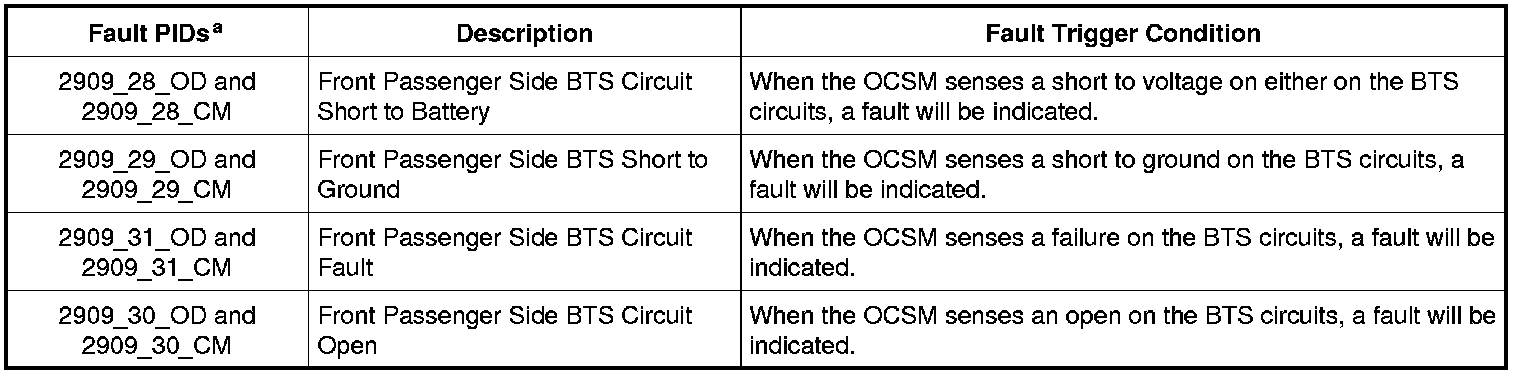 The OCSM monitors the BTS and circuitry for faults. If the OCSM detects a fault on any of the BTS circuits, it will store DTC B2909 in memory and send a message to the Restraints Control Module (RCM), which will store DTC B2290 in memory and send a message to the Instrument Cluster (IC) module to flash a Lamp Fault Code (LFC) 16 on the air bag warning indicator.