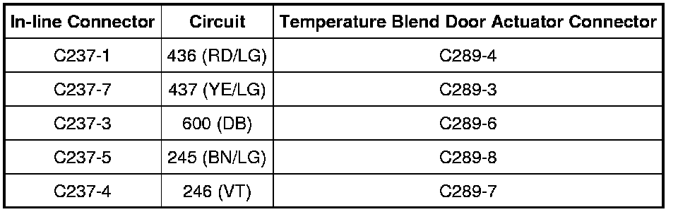 - Measure the high-side resistance between in-line C237-7, circuit 437 (YE/LG), instrument panel harness side and in-line C237-3, circuit 600 (DB), instrument panel harness side while rotating the temperature control potentiometer between full WARM to full COOL.