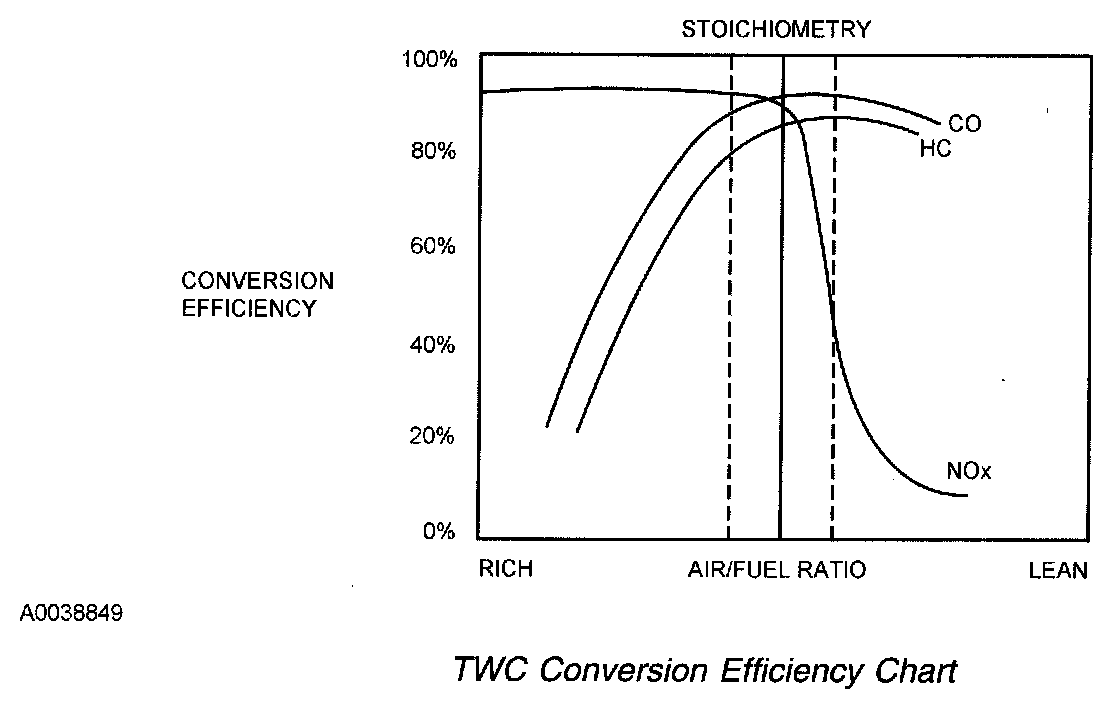 A TWC requires a stoichiometric air/fuel ratio, 14.7 pounds of air to 1 pound of gasoline (14.7:1), for high conversion efficiency. In order to achieve these high efficiencies, the air/fuel ratio must be tightly controlled with a narrow window of stoichiometry. Deviations outside of this window greatly decrease the conversion efficiency. For example a rich mixture decreases the HC and CO conversion efficiency while a lean mixture decreases the NOx conversion efficiency.
