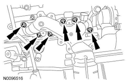 - Discard the 6 LH catalytic converter manifold nuts and gasket.