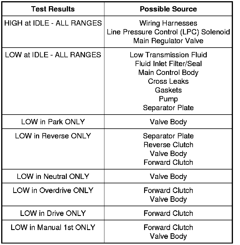 2. Start the engine and check the line pressures see the line pressure chart to determine if the line pressure is within specification.