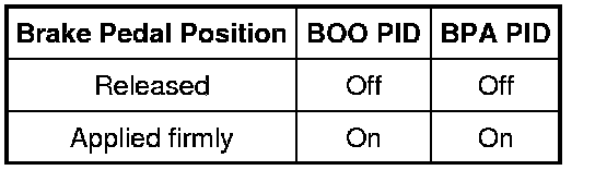 - Monitor the PCM PIDs BOO (brake pedal top travel) and BPA (brake pedal bottom travel) while applying and releasing the brake pedal as follows: