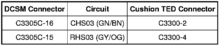 - Measure the resistance between DCSM C3305C, harness side and cushion TED C3300, harness side using the following chart.