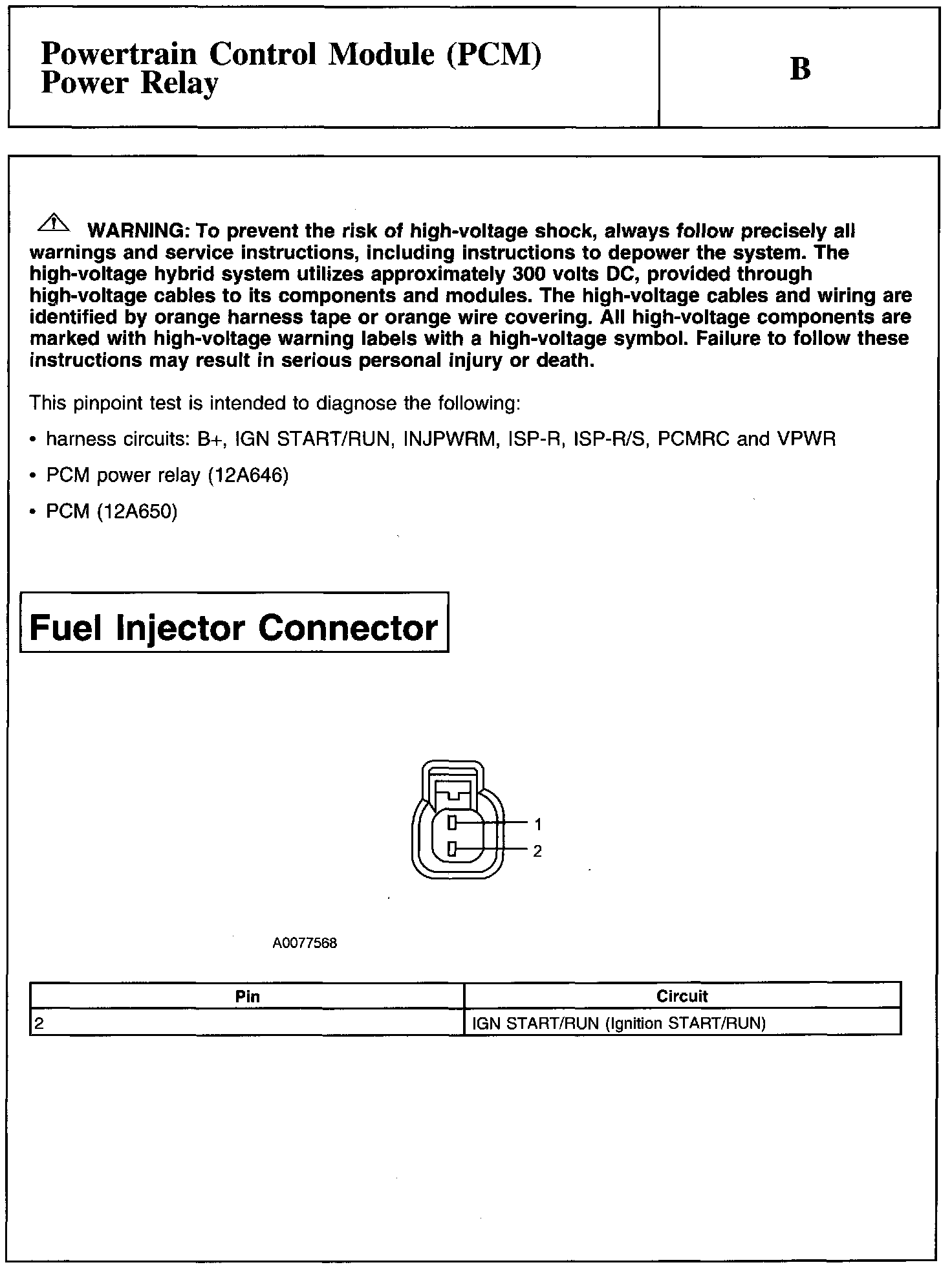 PINPOINT TEST B: POWERTRAIN CONTROL MODULE (PCM) POWER RELAYWarning And Fuel Injector Connector: