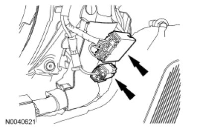 14. Disconnect the electrical connector and the 2 wire harness retainers located on the floor between the front seats.