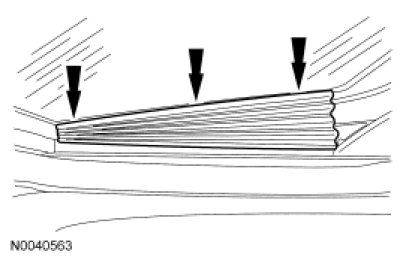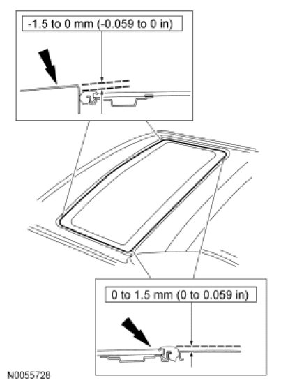 4. NOTE: The correct position of the roof opening panel glass to the roof panel should be -1.50 mm to 0 mm (-0.059 to 0 in) at the front edge and 0 mm to 1.5 mm (0 to 0.059 in) at the rear edge of the roof panel.