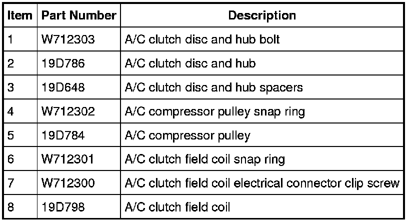 1. Remove the A/C compressor. For additional information, refer to Air Conditioning (A/C) Compressor - 2.5L Service and Repair or Air Conditioning (A/C) Compressor - 3.0L, 3.5L Service and Repair.