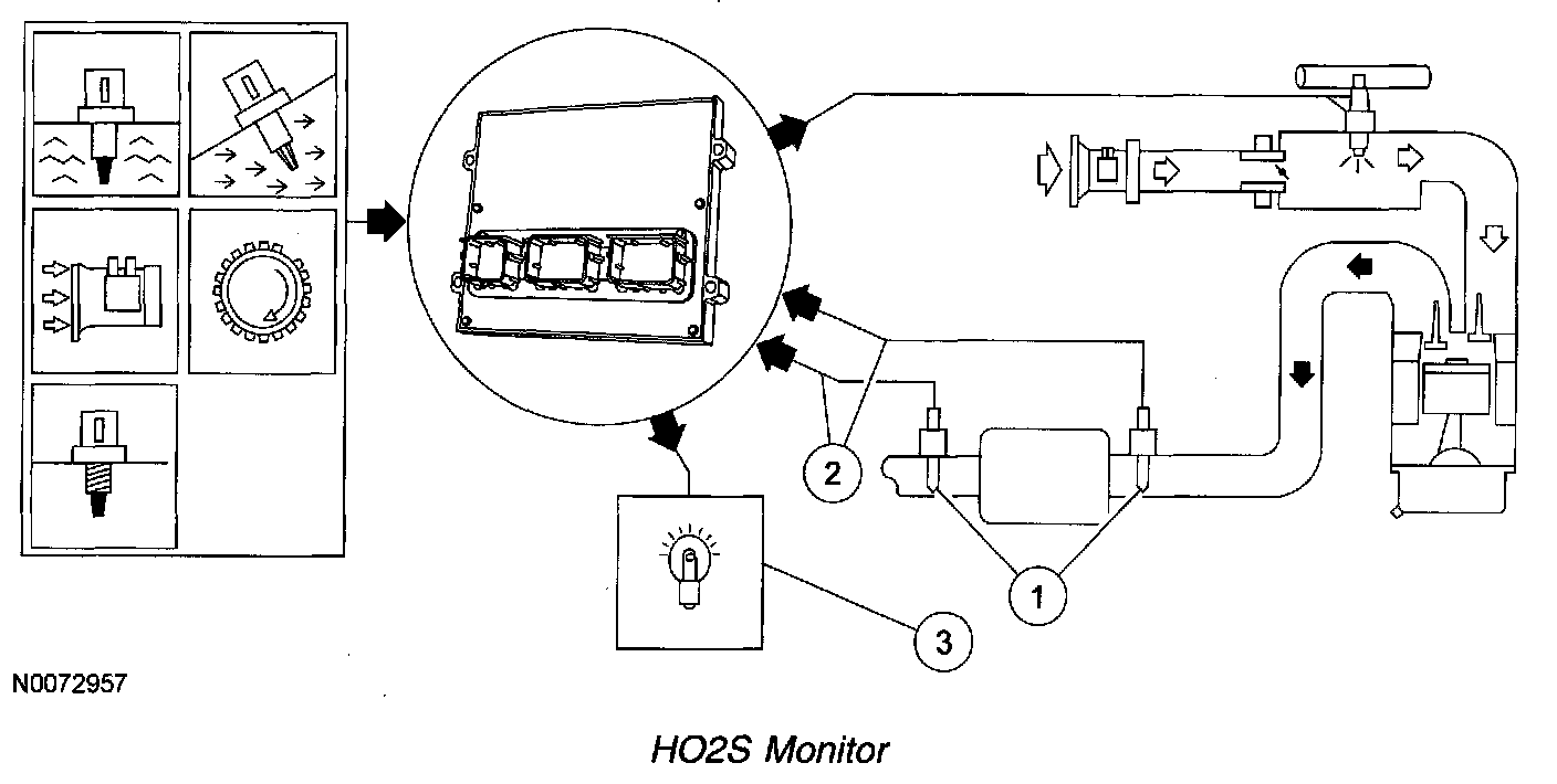 1. The HO2S senses the oxygen content in the exhaust flow. The typical HO2S outputs a voltage between 0 and 1.0 volt. Lean of stoichiometric, air/fuel ratio of approximately 14.7: 1, the HO2S generates a voltage between 0 and 0.45 volt. Rich of stoichiometric, the HO2S generates a voltage between 0.45 and 1.0 volt. The current required to maintain the universal HO2S at 0.45 volt is used by the powertrain control module (PCM) to calculate the air/fuel ratio. The HO2S monitor evaluates the HO2Ss for correct function.