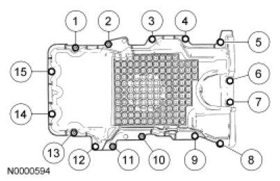 21. Tighten the oil pan bolts in the sequence shown to 25 Nm (18 lb-ft).