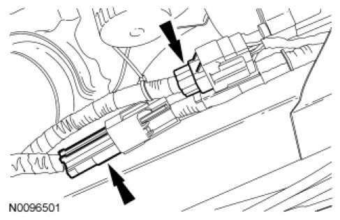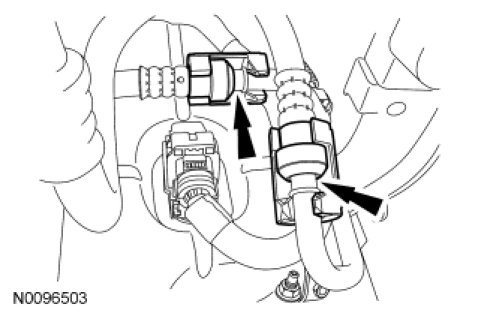 58. Position the transmission fluid cooler tubes in place. Install the transmission fluid cooler tubes in the transaxle by inserting the tube into the fitting until a click is heard/felt. Pull back to confirm connection is secure and install the secondary latches.