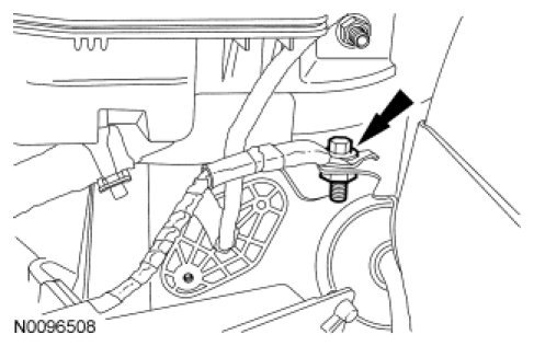76. Install the EPAS ground wire and bolt in the RH front wheel well.