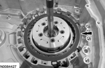 Install the forward (1, 2, 3, 4) clutch beveled snap ring with the flat side down with the gap facing the front of the transaxle.