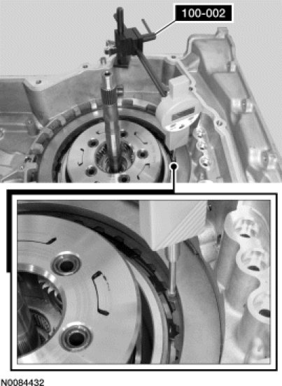67. Apply 483 kPa (70 psi) of air pressure to the forward (1, 2, 3, 4) clutch piston port while recording the clutch pack clearance on the dial indicator. The clearance should be between 0.076 mm (0.002 in) and 1.840 mm (0.072 in). If the clearance is out of range, check the forward (1, 2, 3, 4) clutch pack for correct installation and the transaxle for correct assembly. If the forward (1, 2, 3, 4) clutch pack is correctly installed, install a new forward (1, 2, 3, 4) clutch pack.