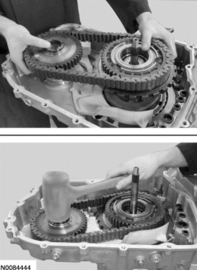 82. Simultaneously install the drive/driven sprocket and chain assembly. Lightly tap on the driven sprocket to be sure it is fully seated in the case.