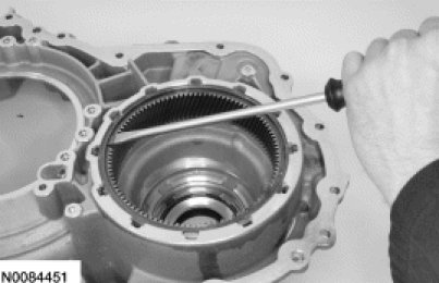 95. NOTICE: Be sure the flat side of the beveled snap ring is facing down or the ring can come loose, causing damage to the transaxle.