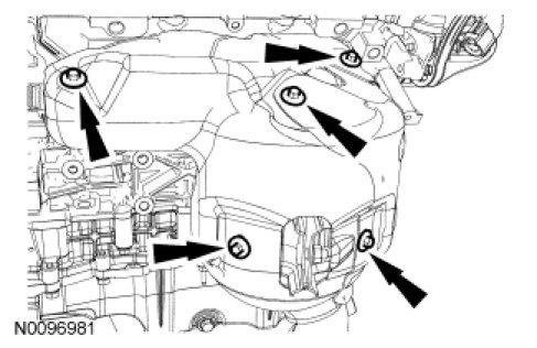 9. Remove the EGR valve and tube. For additional information, refer to Engine Emission Control - 3.0L (4V) Exhaust Gas Recirculation (EGR) Valve and Service and Repair.