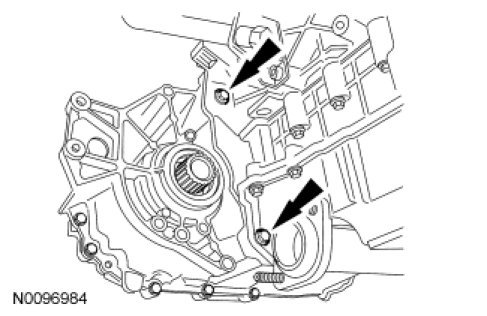 54. Remove the 2 back torque converter housing bolts and remove the transaxle from the dowel pins.