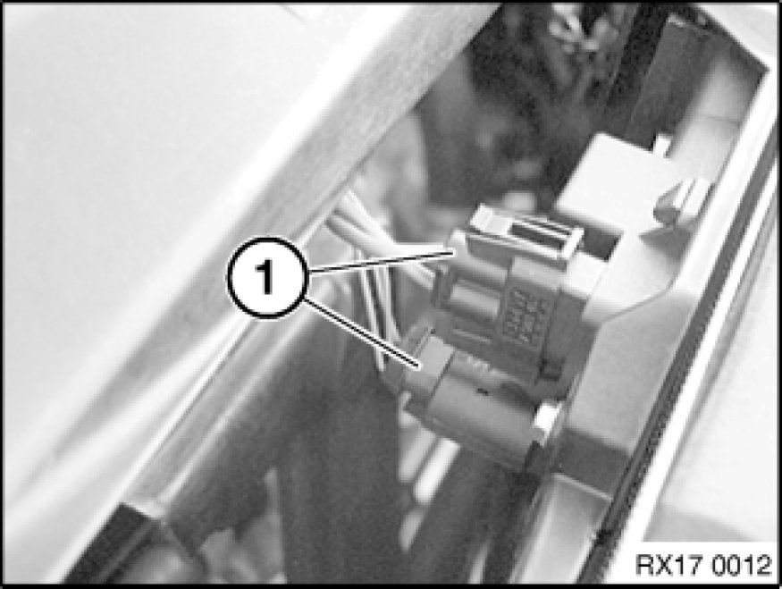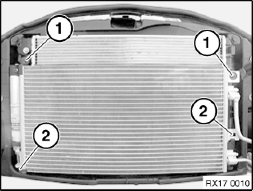 Remove retaining screws (1) of condenser and lift condenser out of fixture/retaining lug (2).