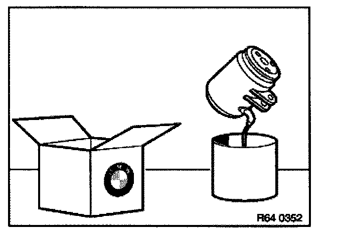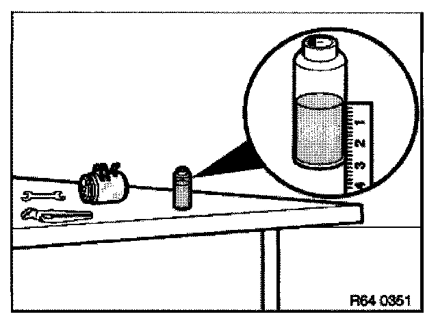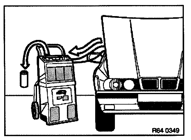After evacuation, the refrigerant must be filtered in the service station as the oil separator could still contain a liquid refrigerant oil mixture. The filtering process gasifies the refrigerant completely and only the previously bound refrigerant oil remains in the oil separator. Measure and note down this amount of refrigerant oil, refer to Evacuating A/C system.