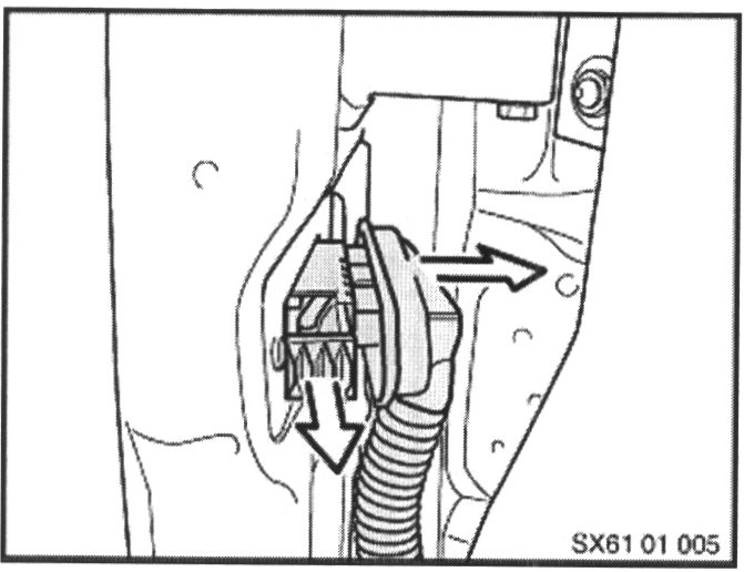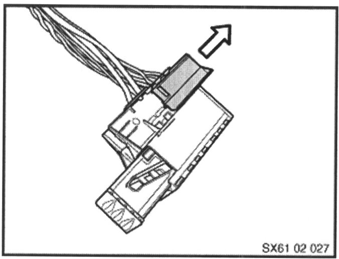 ^ Pull the connector carefully out of the "A" pillar as far as possible. Release the catches and remove the blue locking slide from the connector.