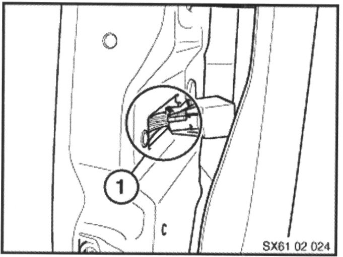^ Inspect the "A" pillar surface finish in the area where it abuts the door harness seal (1). The surface must be flat and free from paint runs, wax runs or any other irregularity. Flatten and/or clean the area accordingly.