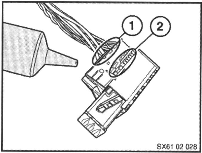 ^ Apply connector grease (see Parts Information) liberally around and amongst the wires at the back of the connector (1). Also apply grease to the terminals, which are exposed by removal of the locking slide (2), on both sides of the connector. Reinstall the blue locking slide.