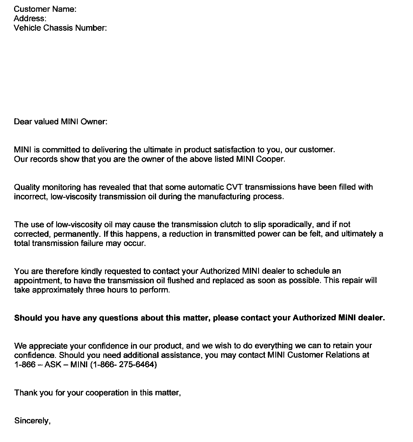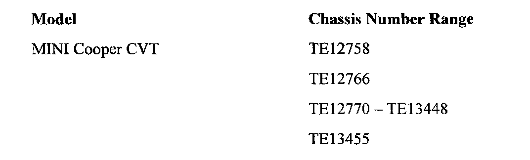 This Service Action involves MINI Cooper vehicles with CVT (Continuously Variable Transmission), which were produced from August 13th, 2002 up to October 23rd, 2002.