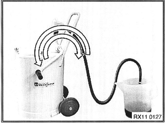 When using an oil pump as shown, transfer 4.5 liters of oil into a clean container in order to determine the number of full strokes/cycles of the pump lever (depending upon displacement of the hydraulic pump used).