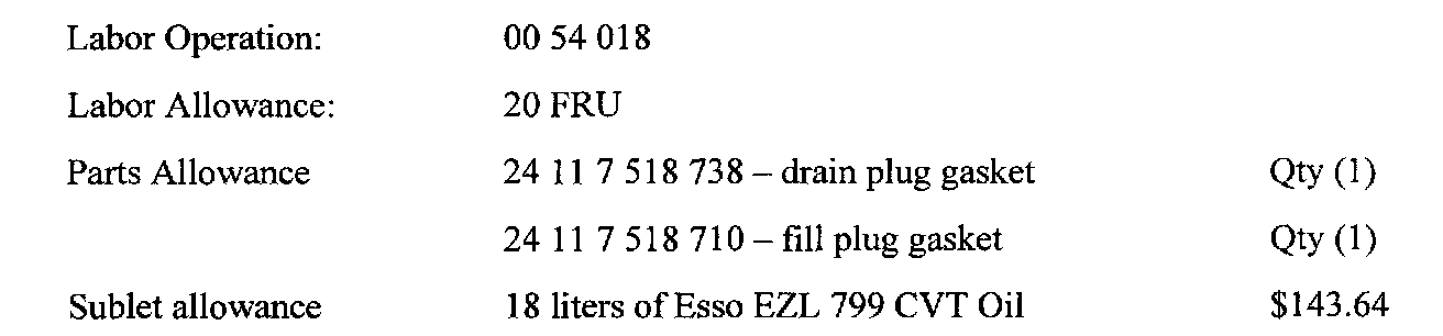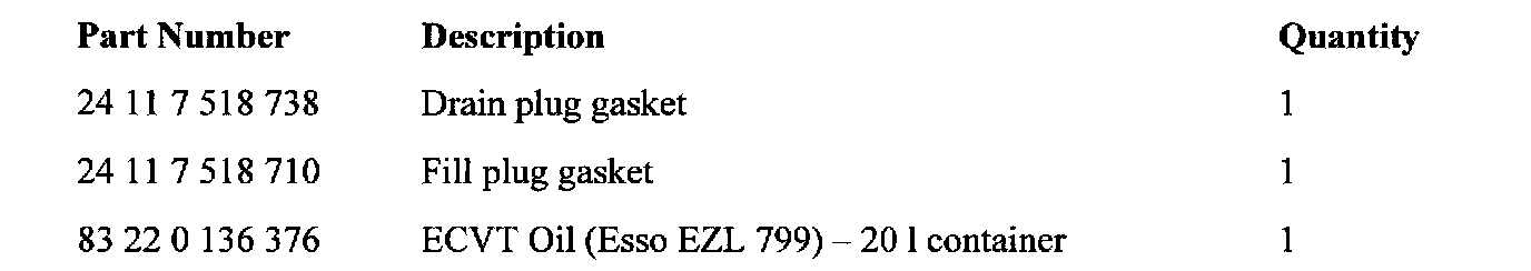 Transmission oil must be drained a total of four times, and filled each time with new original Esso EZL 799 CVT gearbox oil (PN 83 22 081 36 376). For draining and filling-up of CVT transmission refer to RA 00 11 239 (found in BMW TIS).