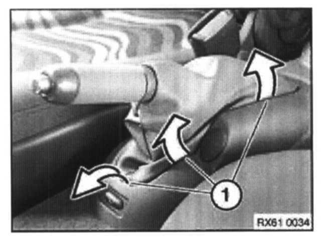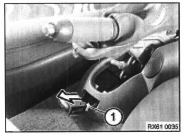 Release handbrake gaiter clips (left hand side shown, right hand side is symmetrical) and partially remove handbrake gaiter for access to rear of RDW switch.