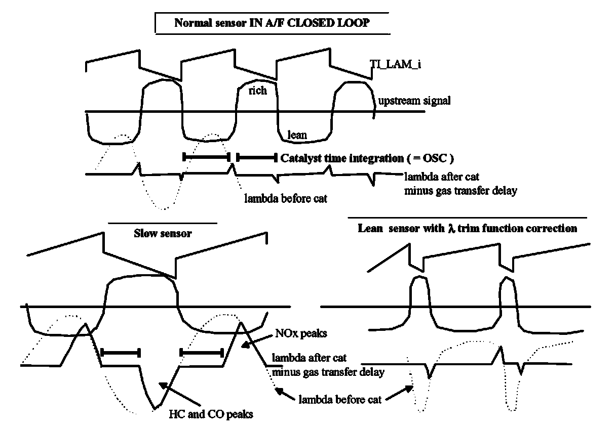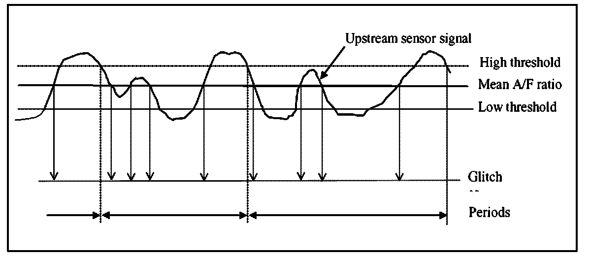 The algorithm is based on the period measurement (starting from lean to rich sensor transition). To avoid non-representative measurement, the period is valid only if the sensor has been below a low threshold and above a high threshold between 2 consecutive lean/rich transitions.