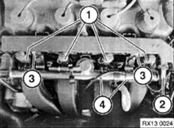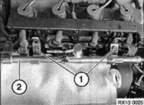 Remove fuel injector rail retaining bolts (1) and gently pull fuel injector rail (2) from manifold.