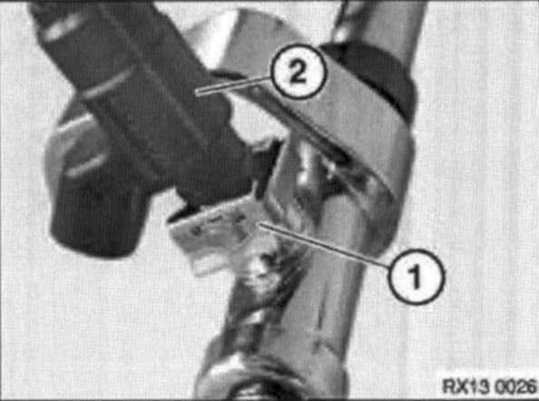 Remove fuel injector retaining clip (1) and remove injector (2).