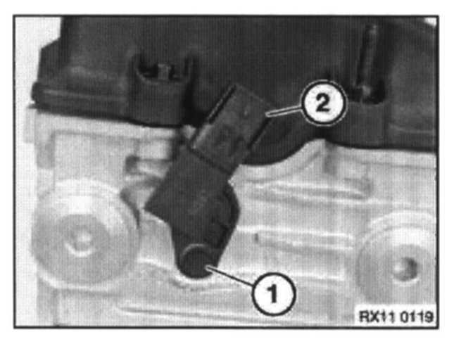 Remove retaining bolt (1) and camshaft sensor (2).
