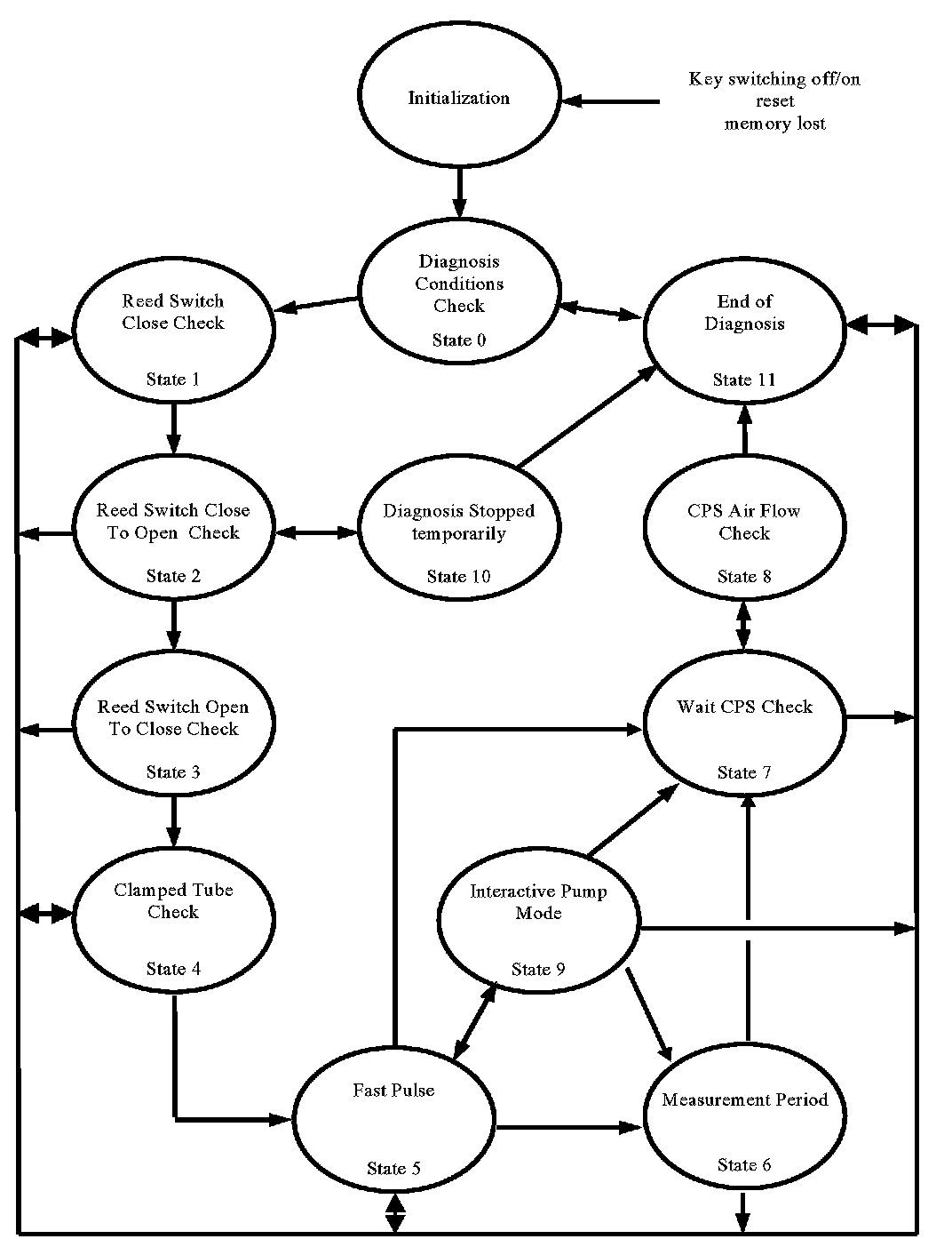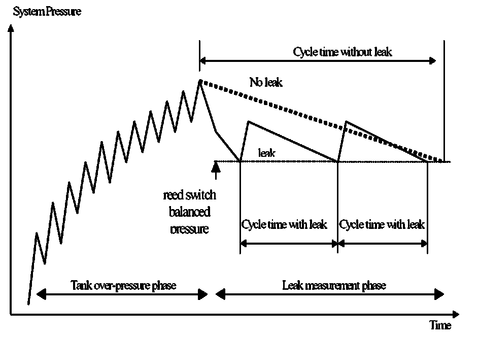 Once the tank system over-pressure phase is finished the leak measurement phase starts. diaphragm stroke is limited by the top of the diaphragm chamber and a position defined by a reed switch level. The over-pressure slows the diaphragm movement. The pump cycle duration depends on the tank pressure. So the evolution of this time shows the over-pressure level.