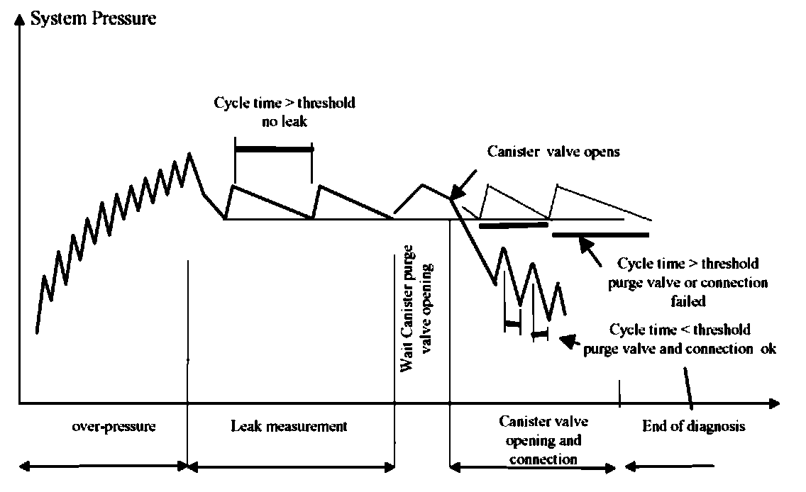 The "pulse interval" is measured by the ECU, which determines whether or not the leak exceeds a defined threshold. Several "pulse interval" measurements are carried out to secure the test.